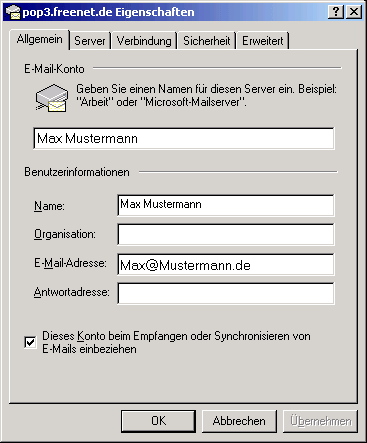 lesen Sie bitte die folgende Anleitung. Schritt 1: Klicken Sie bitte in der Menüleiste auf "Extras > Konten". Wählen Sie bitte mit einem Linksklick ein bestehendes Konto aus und klicken bitte auf "Eigenschaften", um das Konto zu bearbeiten. Um ein neues Konto einzurichten, klicken Sie bitte auf "Hinzufügen - E-Mail" und lesen anschließend hier weiter. ![]() Schritt 2: Um Ihre Benutzerinformationen zu ändern, nehmen Sie diese Einstellungen unter dem Karteireiter "Allgemein" vor. Hier haben Sie die Möglichkeit, Ihren Namen und die E-Mail Adresse zu ändern. ![]() Schritt 3: Um Ihre Servereinstellungen und Ihre Benutzerdaten zu ändern, klicken Sie bitte auf den Karteireiter "Server" und geben Sie bitte die Daten wie folgt ein: ![]()